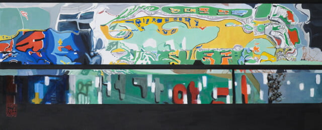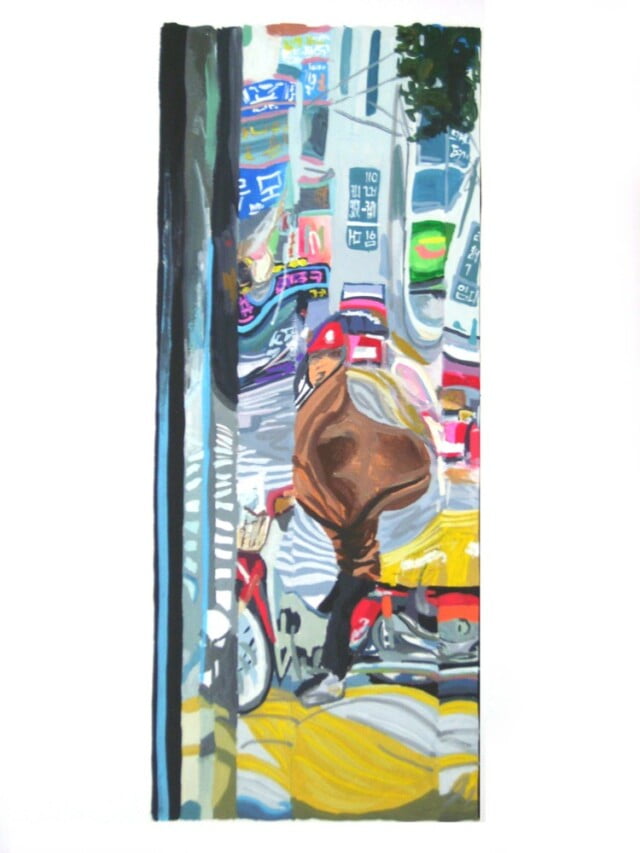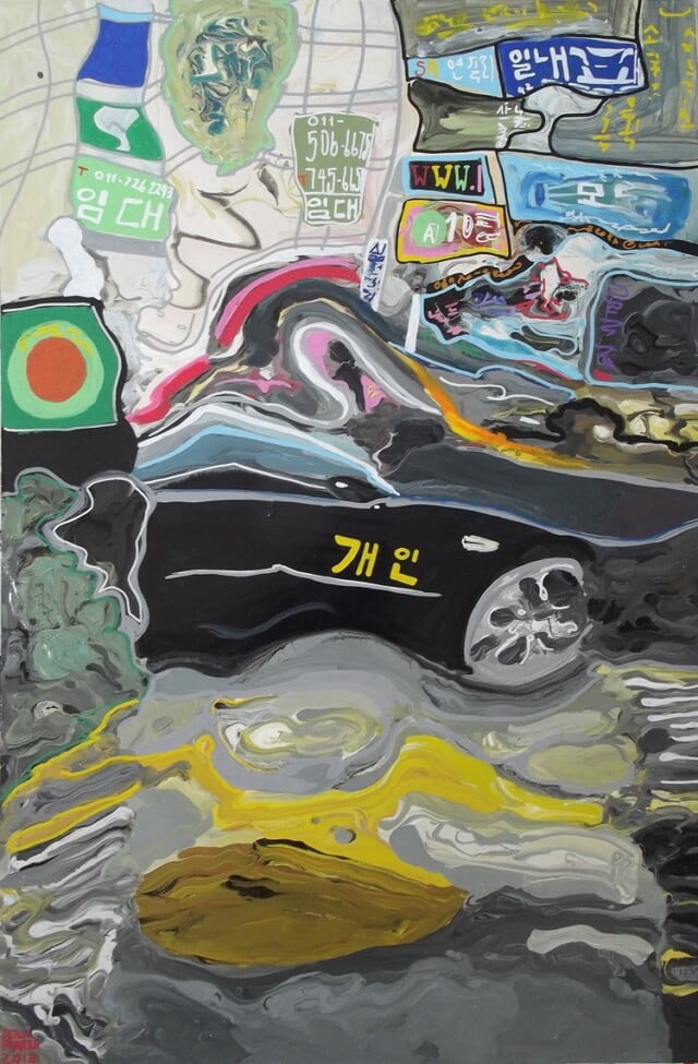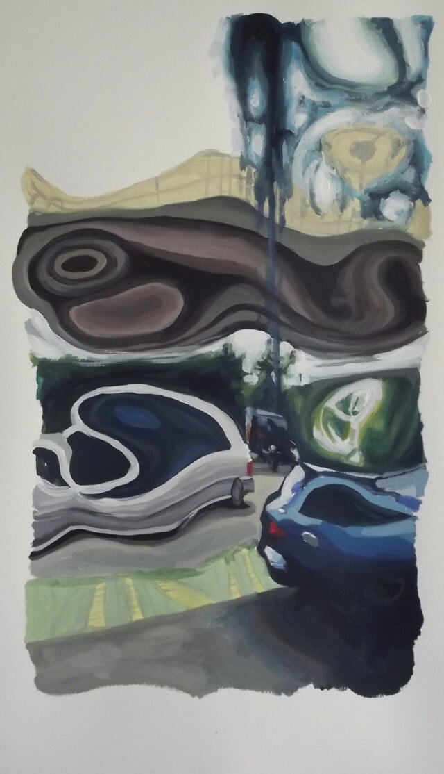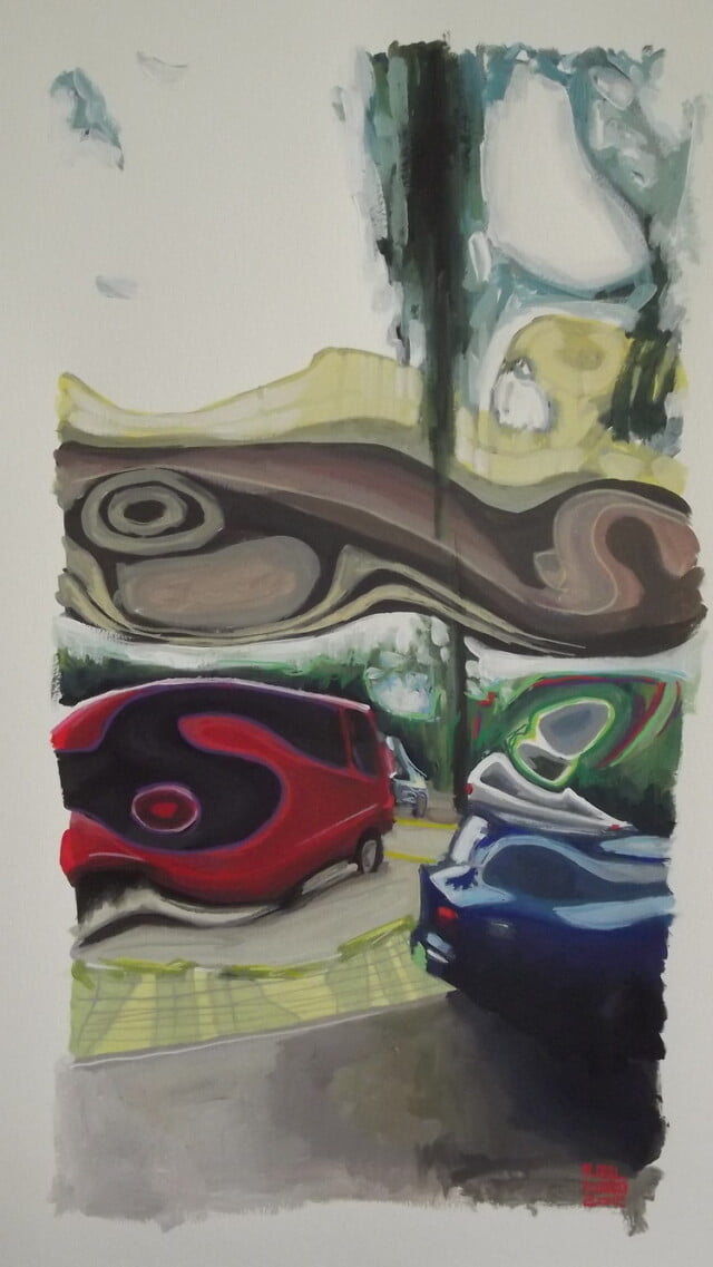 Estas pinturas, son personales e íntimamente ligadas a la ciudad. En su mayoría escenas urbanas, paraderos de buses, peatones, etc. parece como si las estuvieras viendo a través de agua ondulante. Los objetos que contienen están intactos y reconocibles, pero fluidos e indistintos.